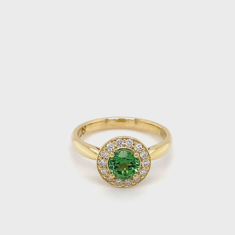 18ct Yellow Gold Tsavorite and Diamond Halo Ring