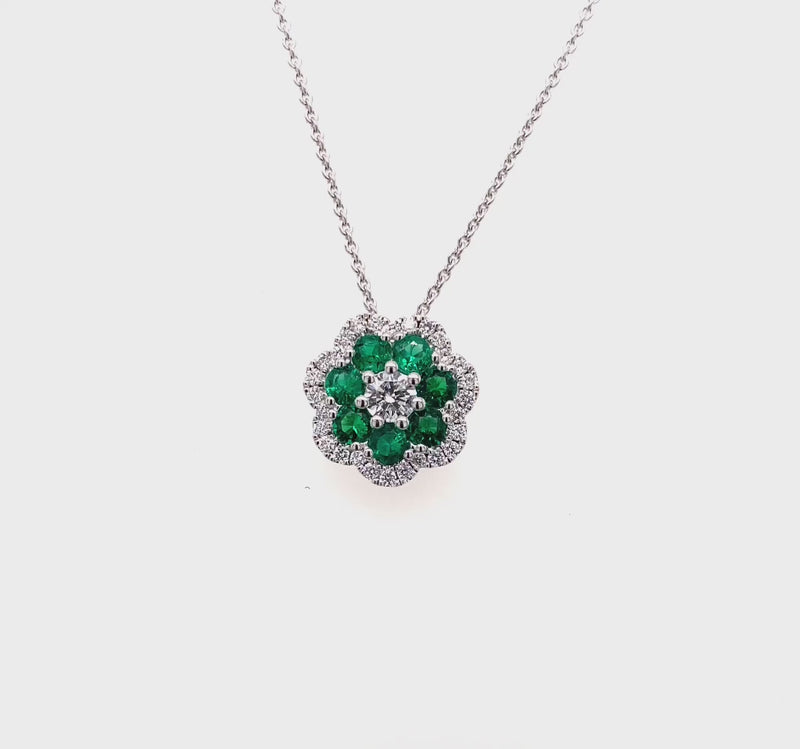 18ct White Gold Emerald and Diamond Flower Pendant with Chain