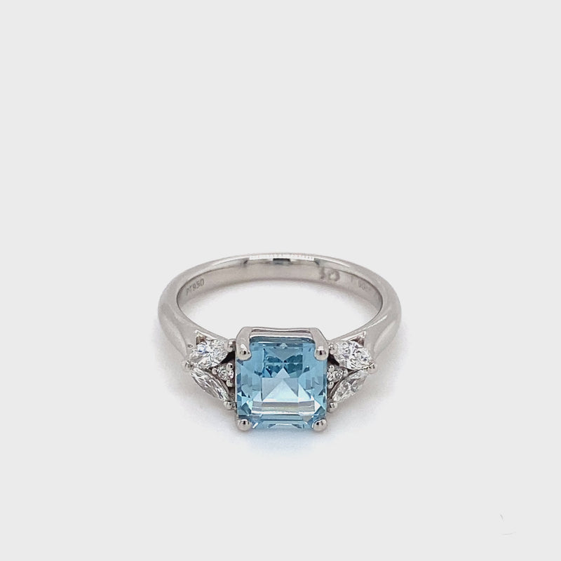 Platinum Asscher-Cut Aquamarine and Diamond Leaf Shoulder Ring