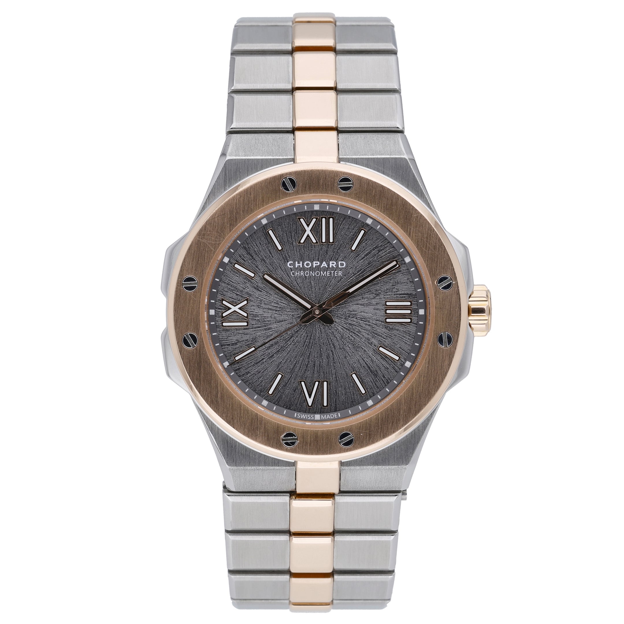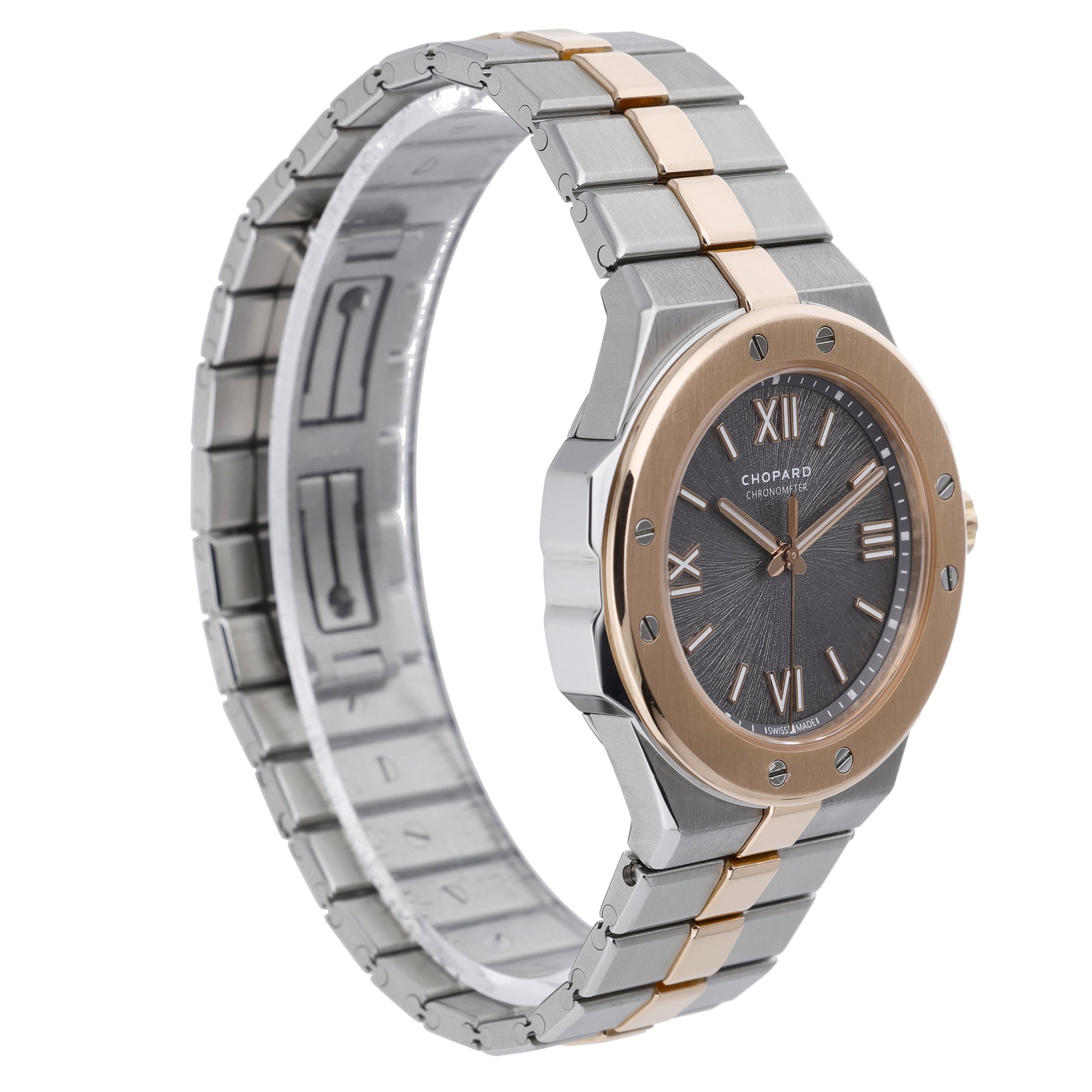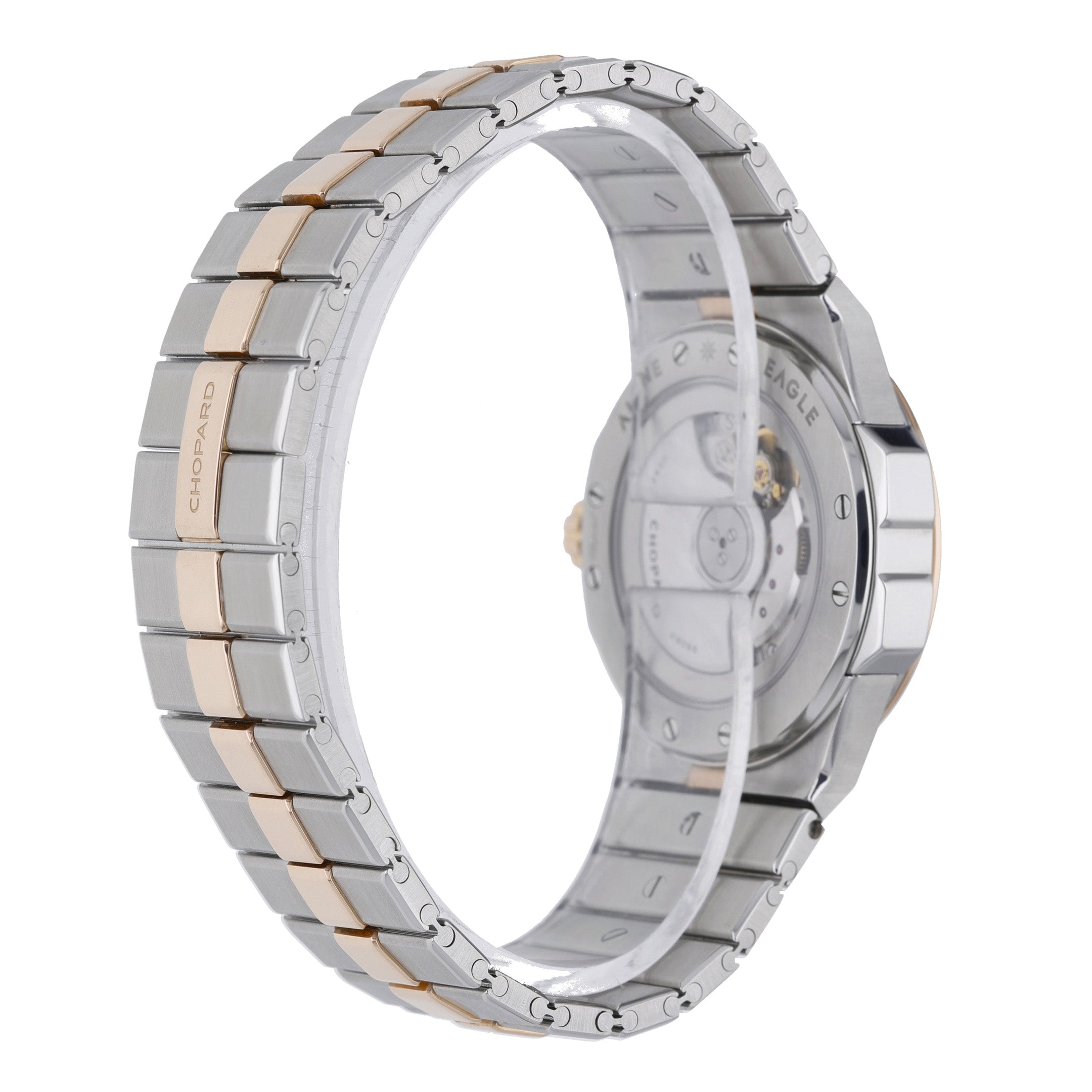 Introducing the exquisite CHOPARD ALPINE EAGLE - 298601-6001 - Watch, a timeless piece that embodies elegance and luxury. Featuring a 36mm case made of steel and rose gold, this watch exudes sophistication and durability. The Alpine Eagle model pays homage to the St Moritz, the birthplace of the brand, where the majestic eagles soar freely in the Swiss Alps. This automatic timepiece is in excellent condition with an estimated production year of 2023, making it a valuable addition to any collection. The folding clasp and water resistance of up to 100M add practicality to its aesthetic appeal. The plain bezel and Roman dial add a classic touch to this modern masterpiece. The steel and rose gold bracelet completes the look, making it perfect for both formal and casual occasions. This watch comes with its original box and papers, further adding to its authenticity. Don't miss your chance to own a piece of Chopard's rich history and elevate your style with the CHOPARD ALPINE EAGLE - 298601-6001 - Watch.