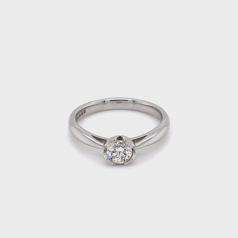 A single stone diamond ring with hearts cut in to the settings to capture light, showing the diamond off to its full extent. A rubbed over design with a comfort fit shank and ergonomic finish. With an enhanced minimal look the absence of claws promises that less is more.