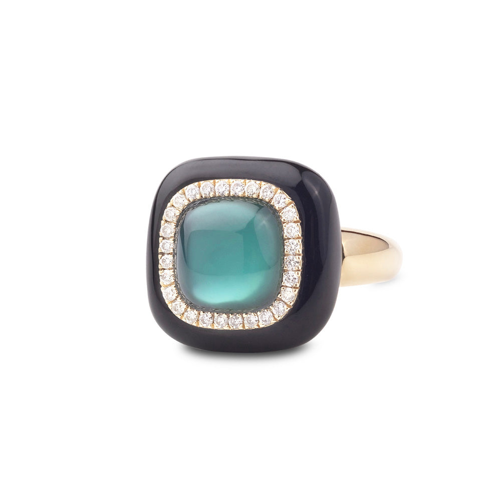 18ct Yellow Gold Black Enamel Green Agate Diamond Ring