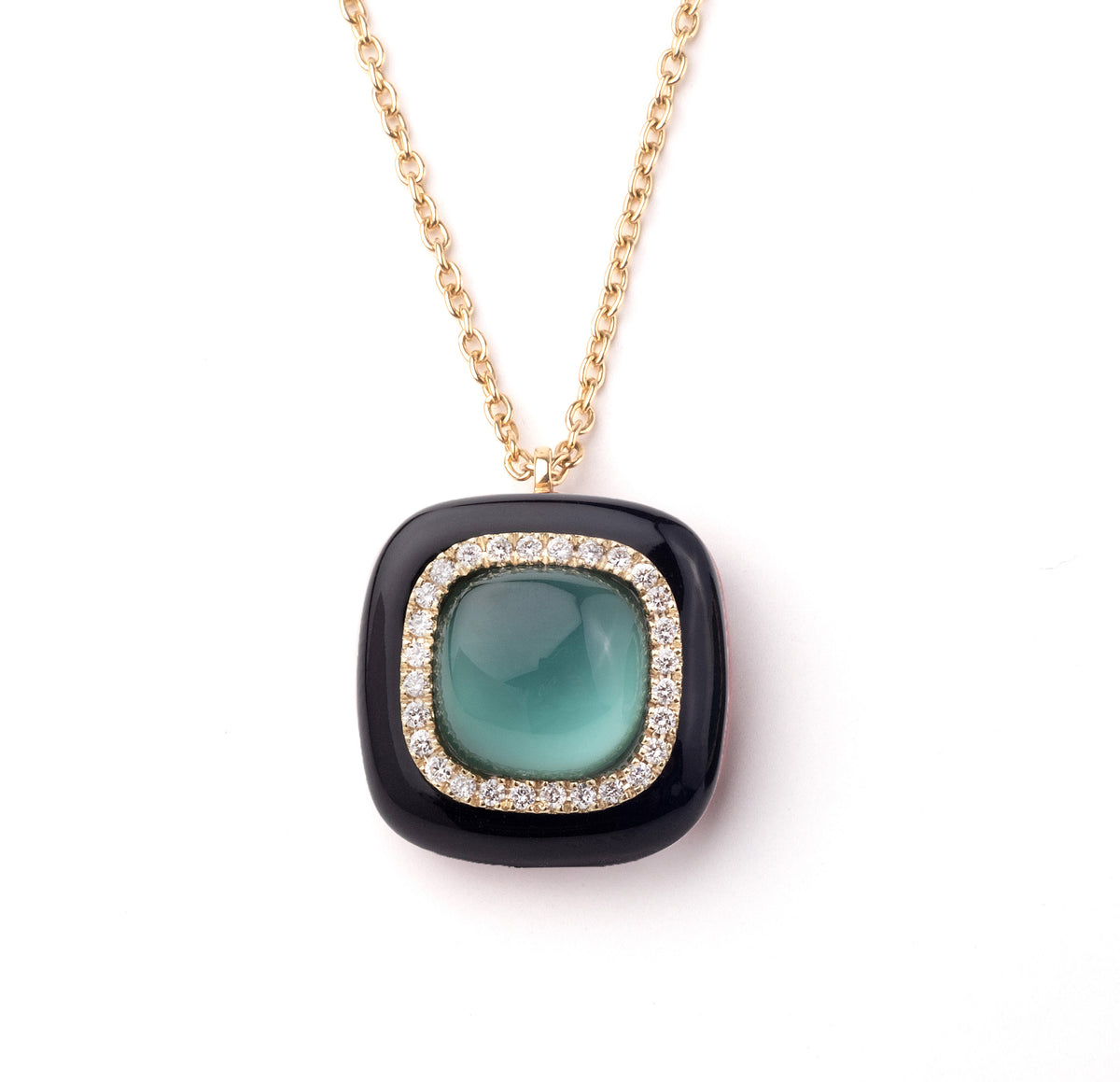 18ct Yellow Gold Black Enamel Green Agate Diamond Pendant