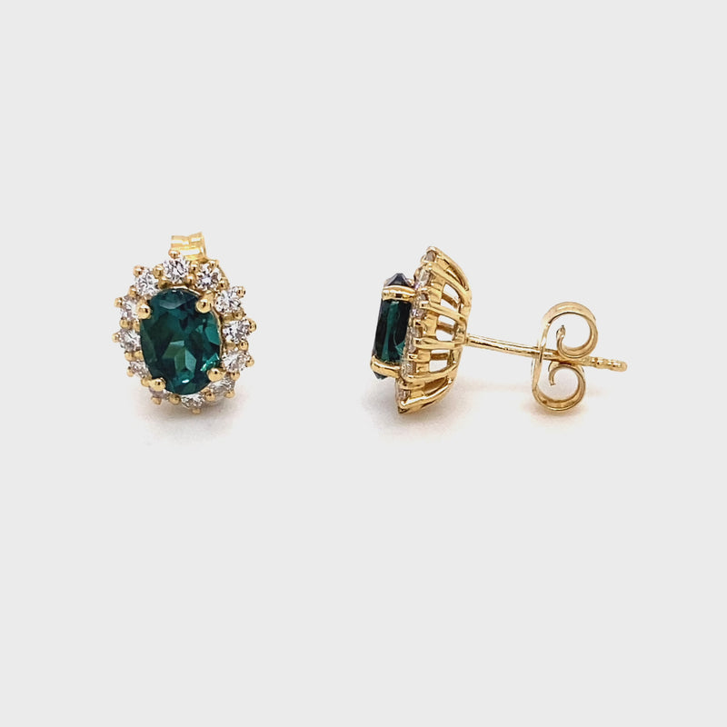 18ct Yellow Gold Oval Green Tourmaline Studs with Diamond Halo