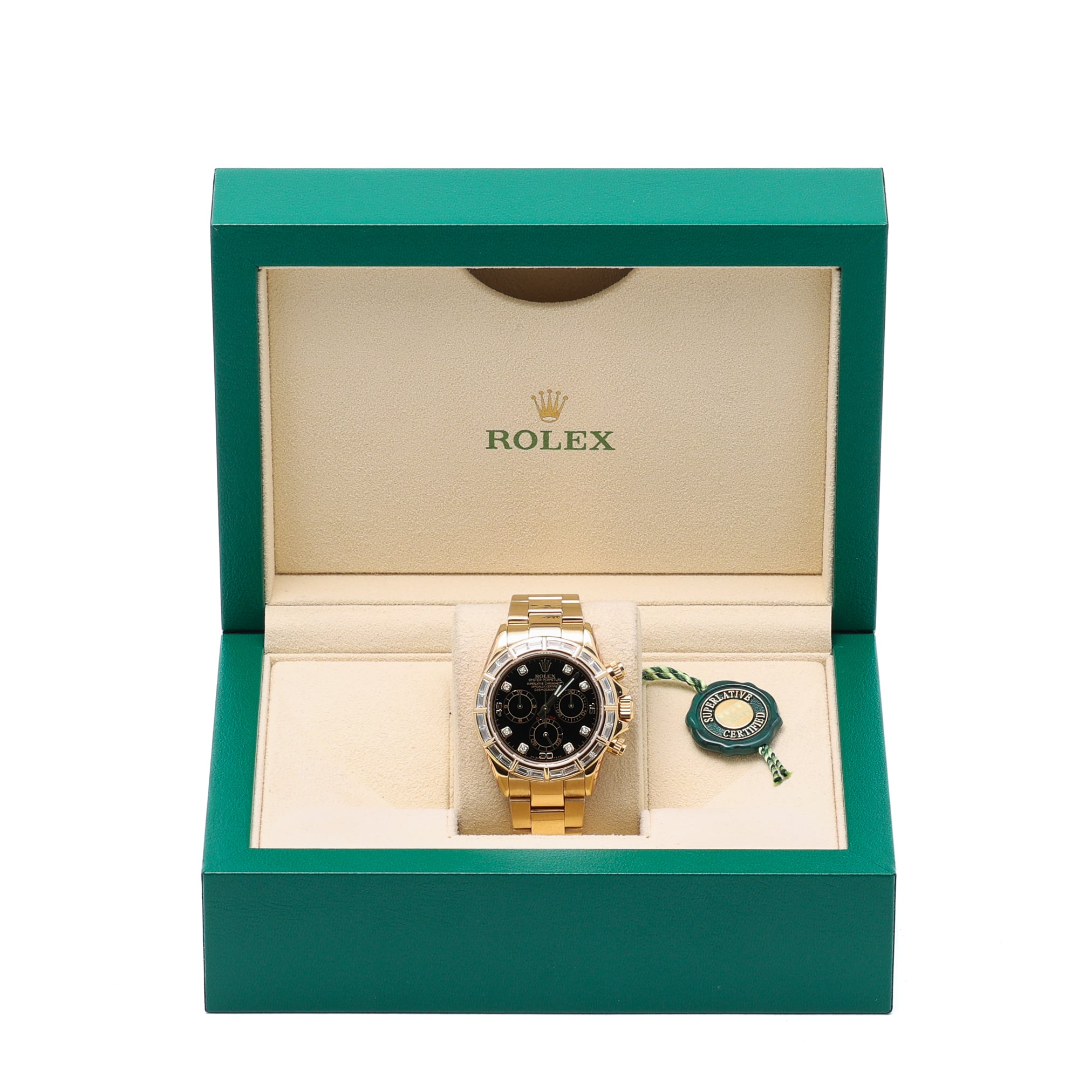 "Experience the epitome of luxury and precision with the iconic ROLEX DAYTONA - 116568BR. This exquisite timepiece boasts a 40mm 18ct Yellow Gold case and bracelet, adorned with sparkling diamonds on the bezel. Originally designed for professional racing drivers, the Daytona has become a highly coveted status symbol, known for its unparalleled performance and style. This particular model, released in 2000, is in excellent condition and comes with service papers and a box. With its automatic movement and chronograph dial, this watch is a must-have for any discerning gent. Elevate your collection and make a statement with the ROLEX DAYTONA - 116568BR."