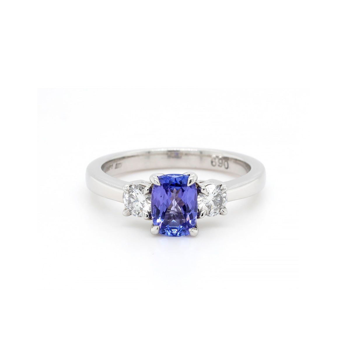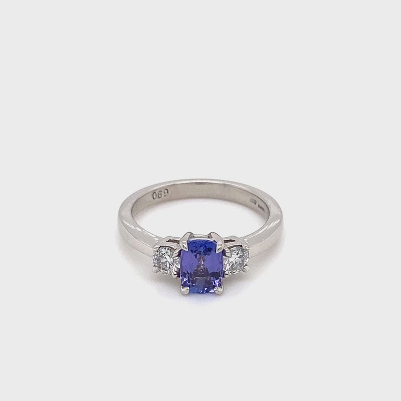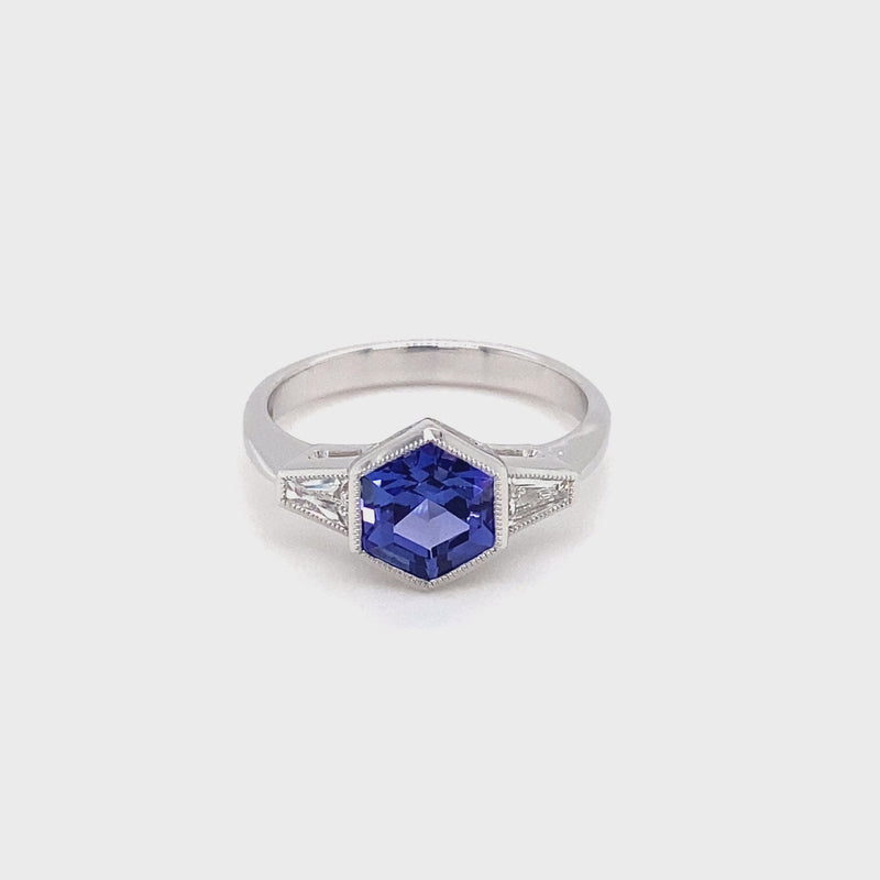 18ct White Gold Hexagon Tanzanite Diamond Three Stone Ring