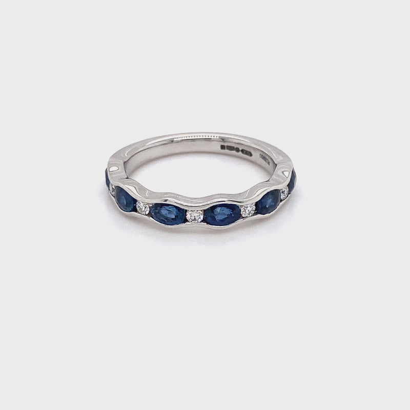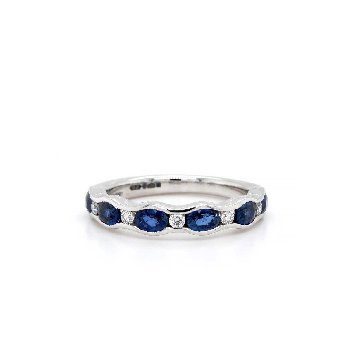 Add a touch of sophistication with the Platinum Sapphire and Diamond Channel Set Eternity Ring. This ring features six oval blue sapphires and five round diamonds set in a channel setting.
