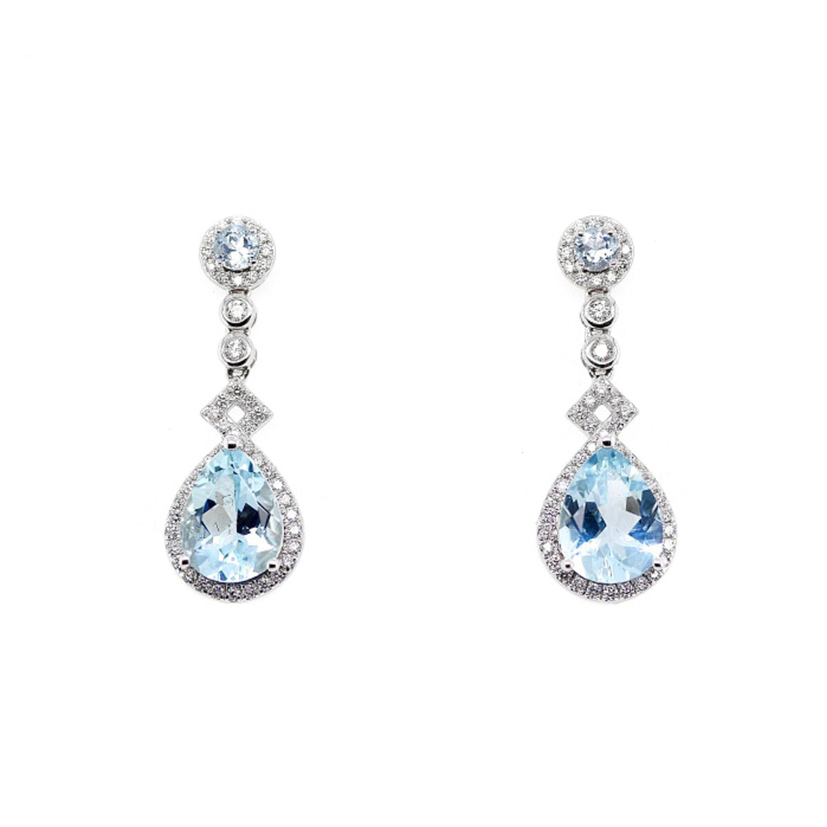 A pair of 18ct White Gold earrings with teardrop-cut Aquamarines surrounded by a halo of fine Diamonds, in an Art Deco style.