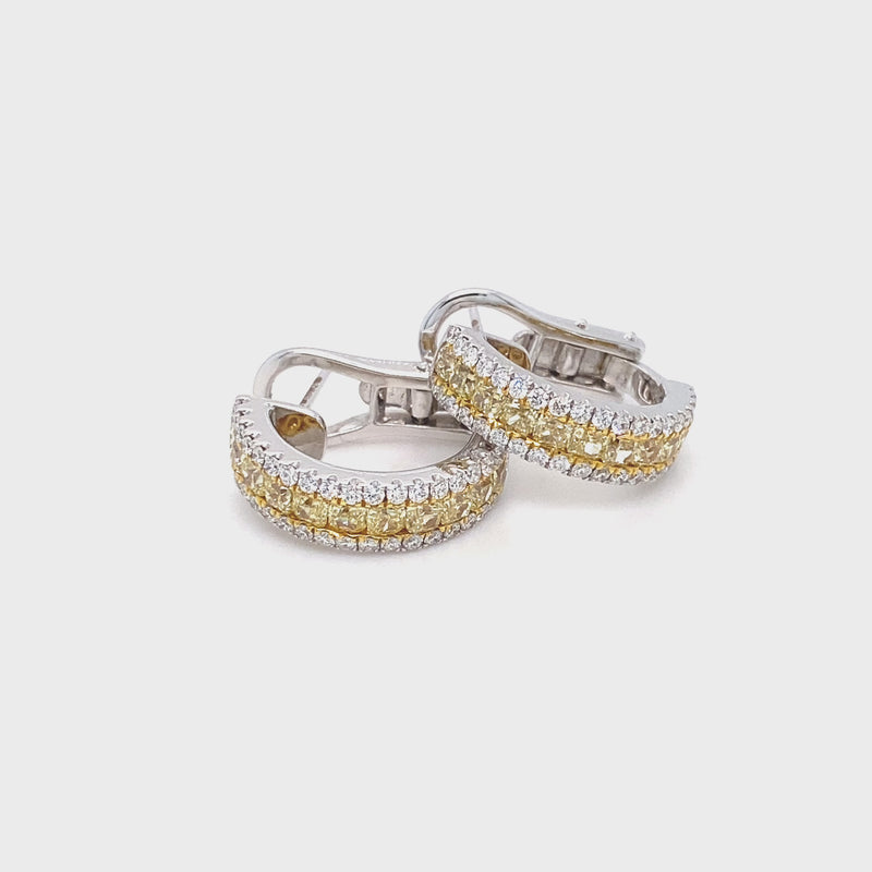 18ct White Gold Cushion Cut Yellow Diamond and Round Diamond 3-Row Hoop Earrings, Yellow Diamond 1.73ct, G/H, SI, Total 0.64ct