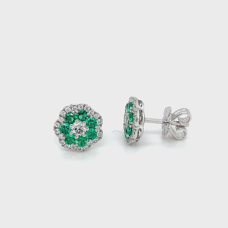 18ct White Gold Emerald and Diamond Flower Stud Earrings