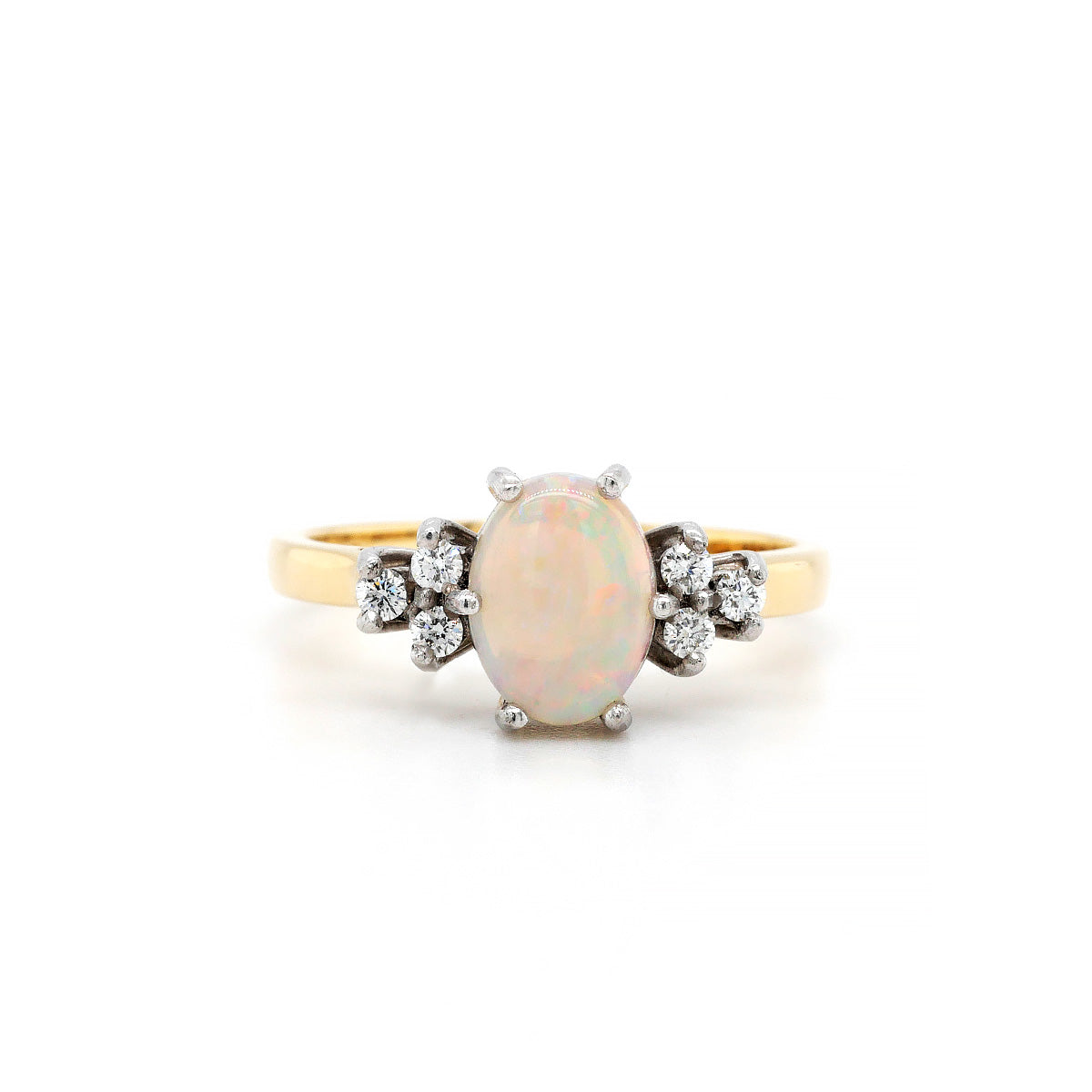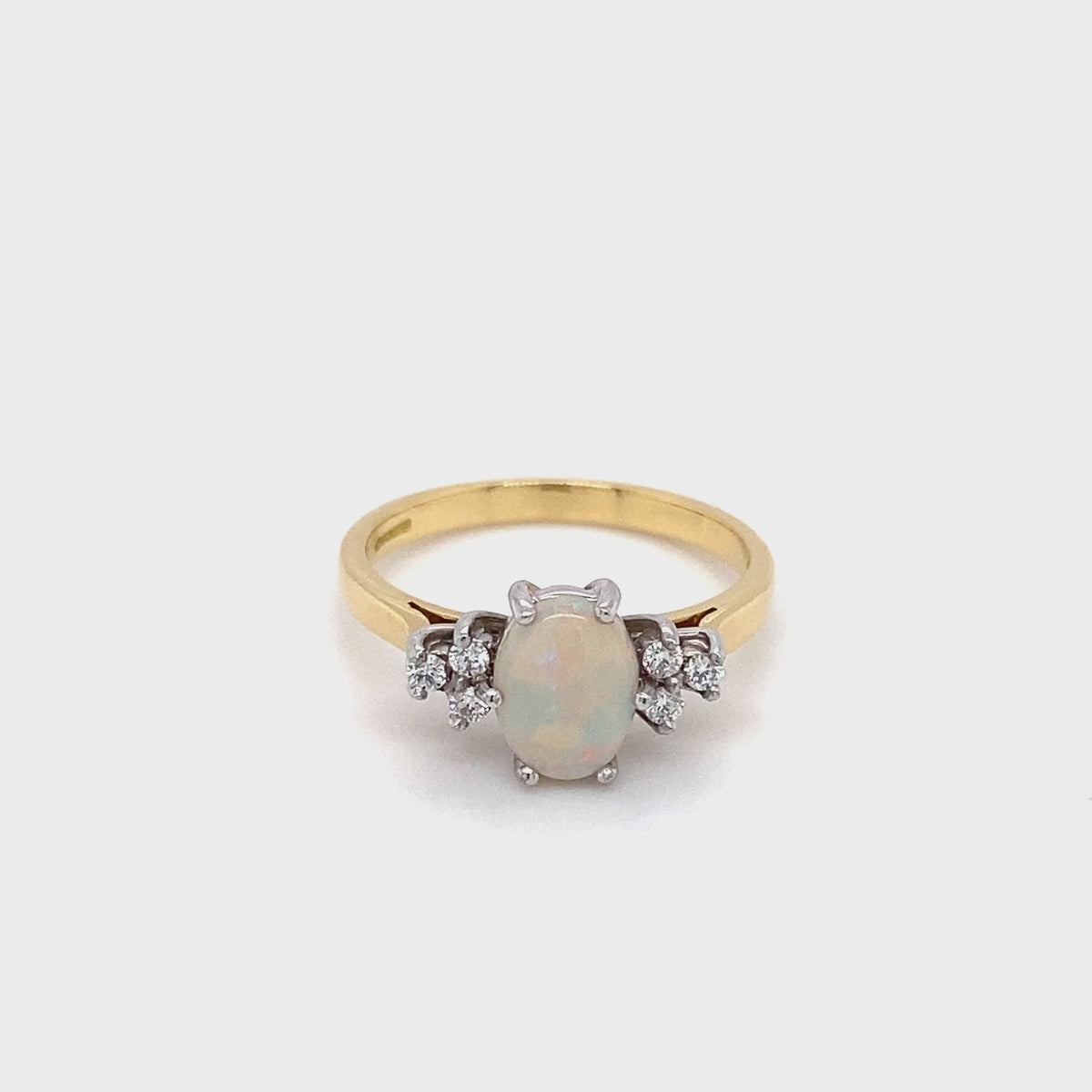 This elegant 18ct yellow and white gold ring features a captivating 0.63ct oval opal as its centrepiece, radiating a soft, iridescent glow. Flanked by six brilliant diamonds three on each side, totalling 0.10ct the design celebrates harmony and sparkle with understated luxury.