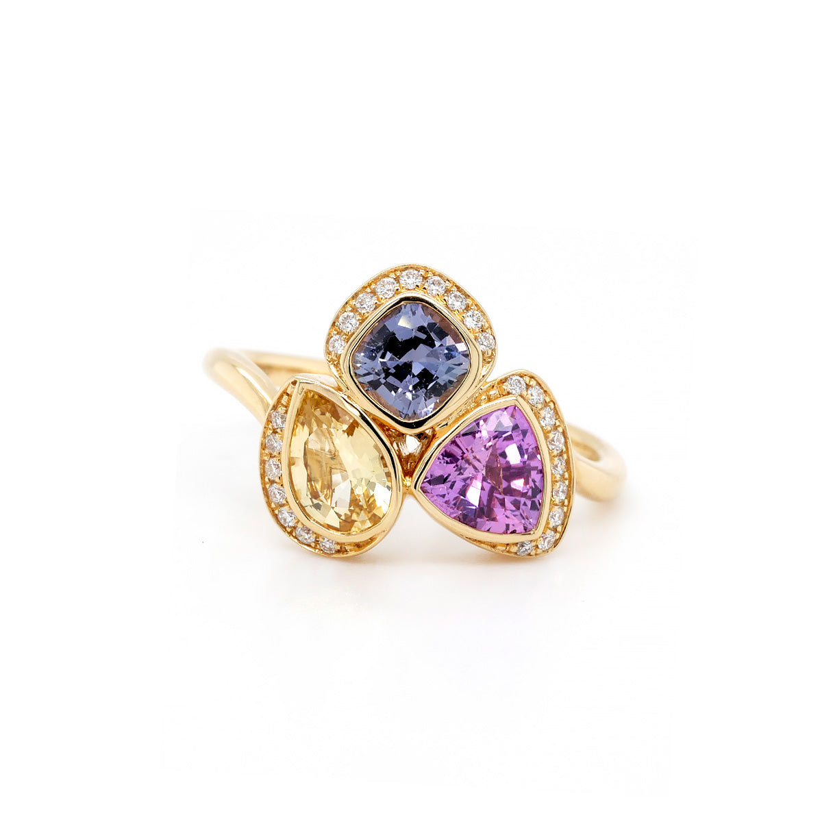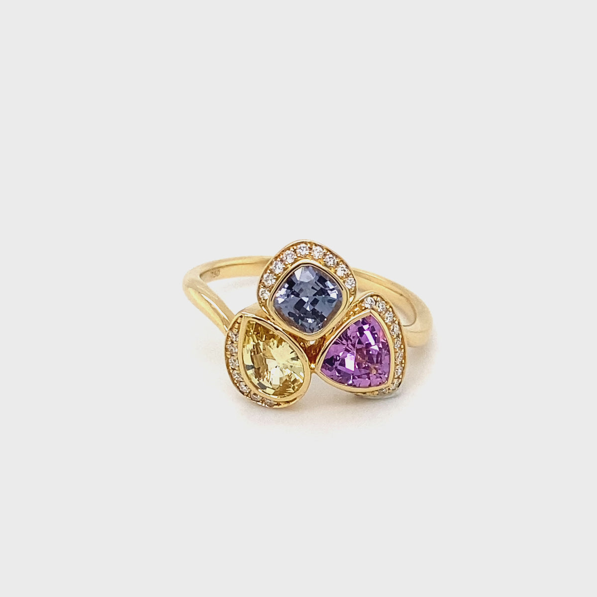 18ct Yellow Gold Fancy Mixed Sapphire and Diamond Ring, 3 Sapphires (Blue, Pink, Yellow) Total 1.72ct