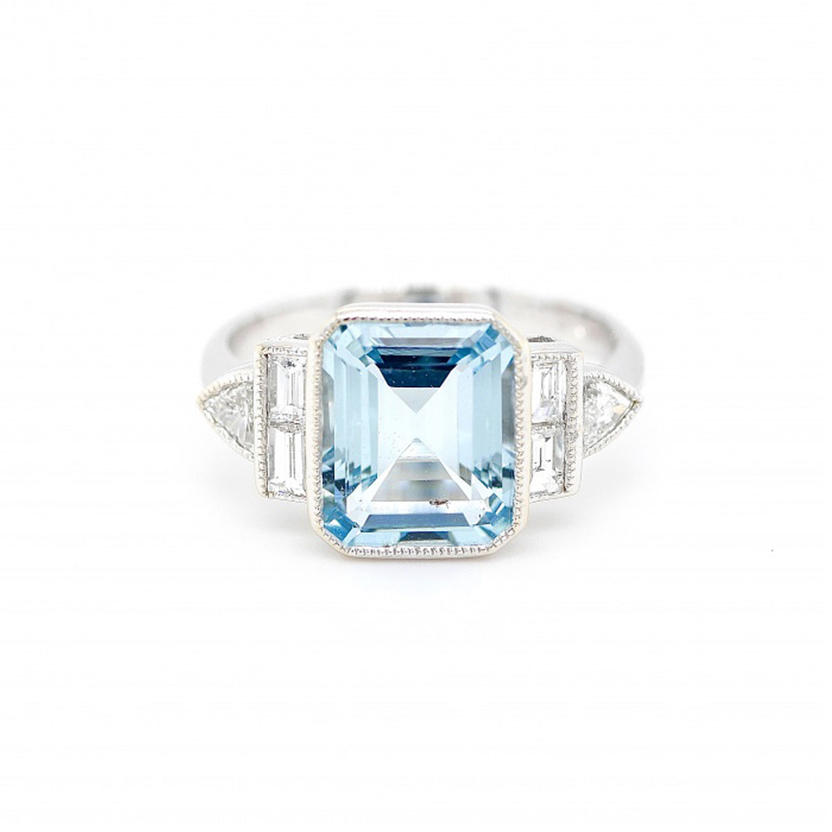 Embrace the elegance of the Art Deco era with this exquisite 18ct White Gold Aquamarine and Diamond Ring. It features a captivating emerald-cut aquamarine as its centrepiece, flanked by baguette-cut diamonds and finished with trilliant-cut diamond accents for a touch of geometric sophistication. This harmonious blend of gemstones and cuts creates a timeless piece that exudes both luxury and refinement.