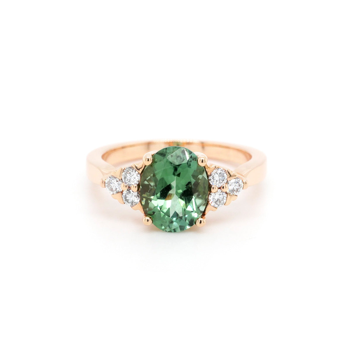 Discover the allure of this rose gold ring, featuring an enchanting central oval-cut Green Tourmaline flanked by three round-brilliant Diamonds on each side. The warm hues of the rose gold beautifully complement the deep green of the Tourmaline, while the diamonds add a touch of timeless elegance. This ring is a masterpiece of design and craftsmanship, perfect for those who appreciate the unique combination of luxury and natural beauty.