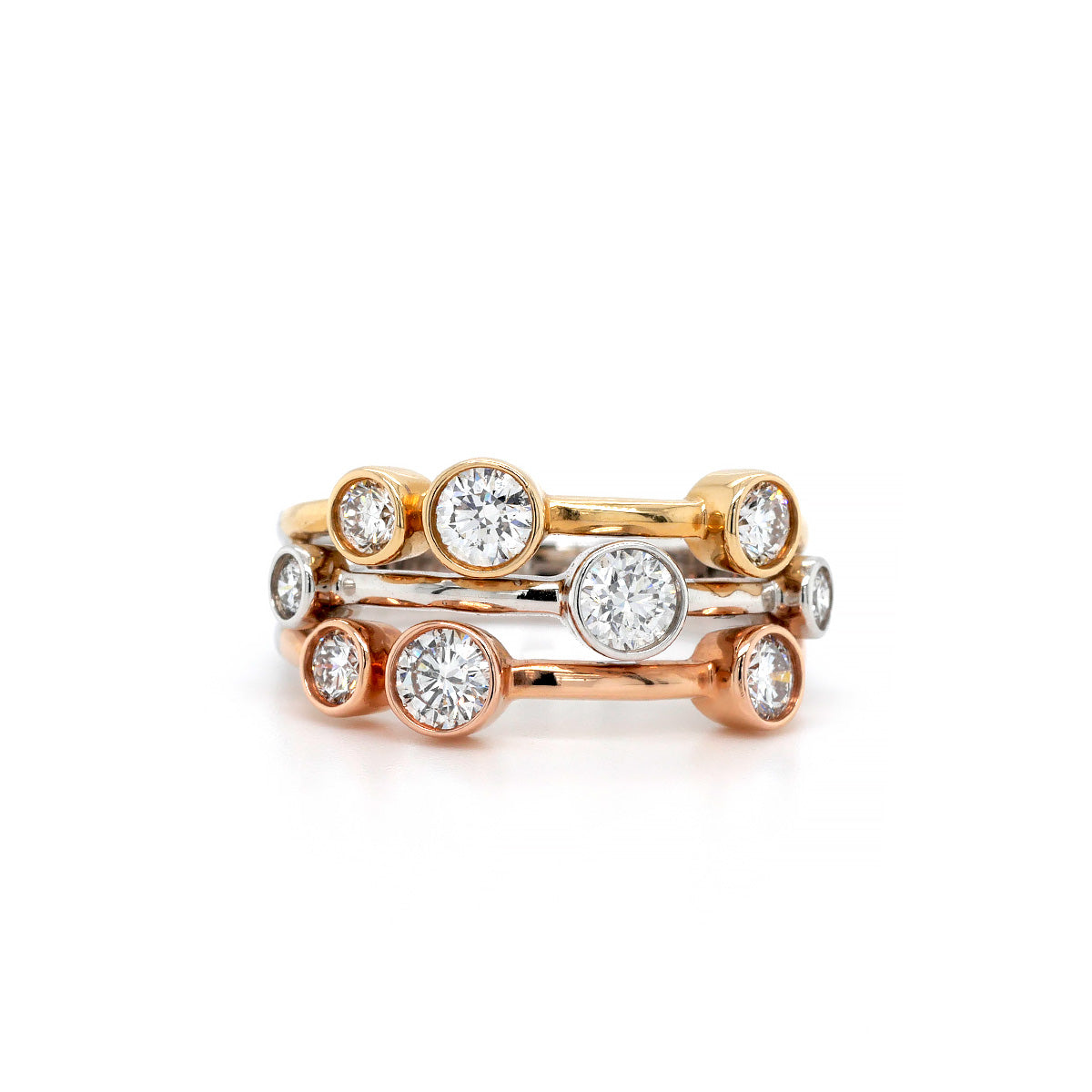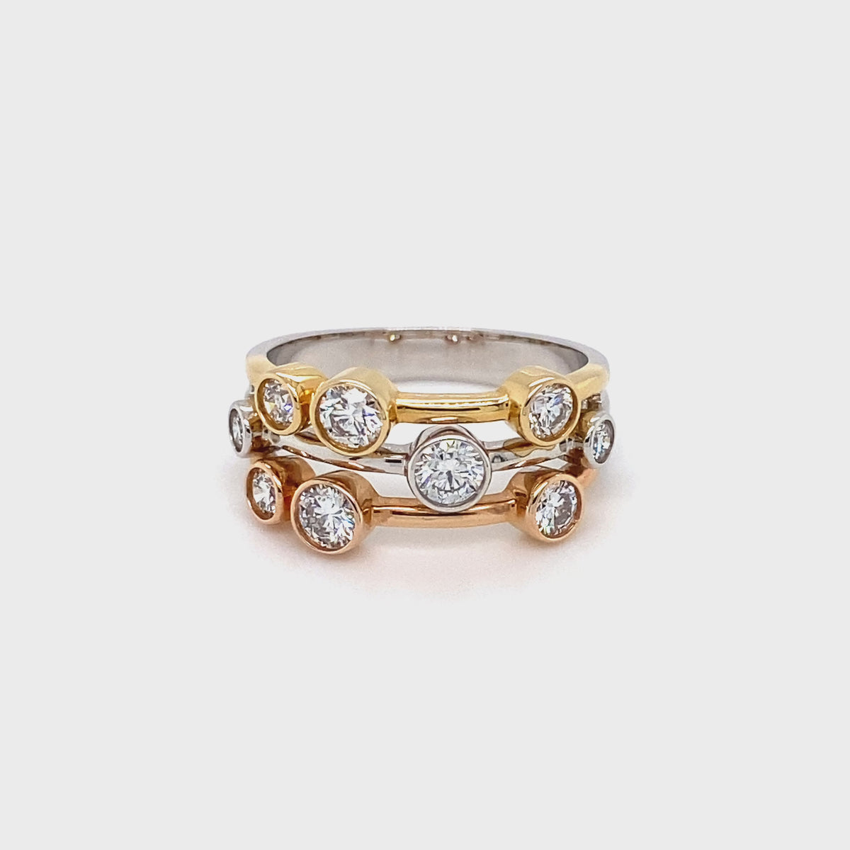 18ct Tri-Colour Gold 3 Row Bubble Ring with Diamonds
