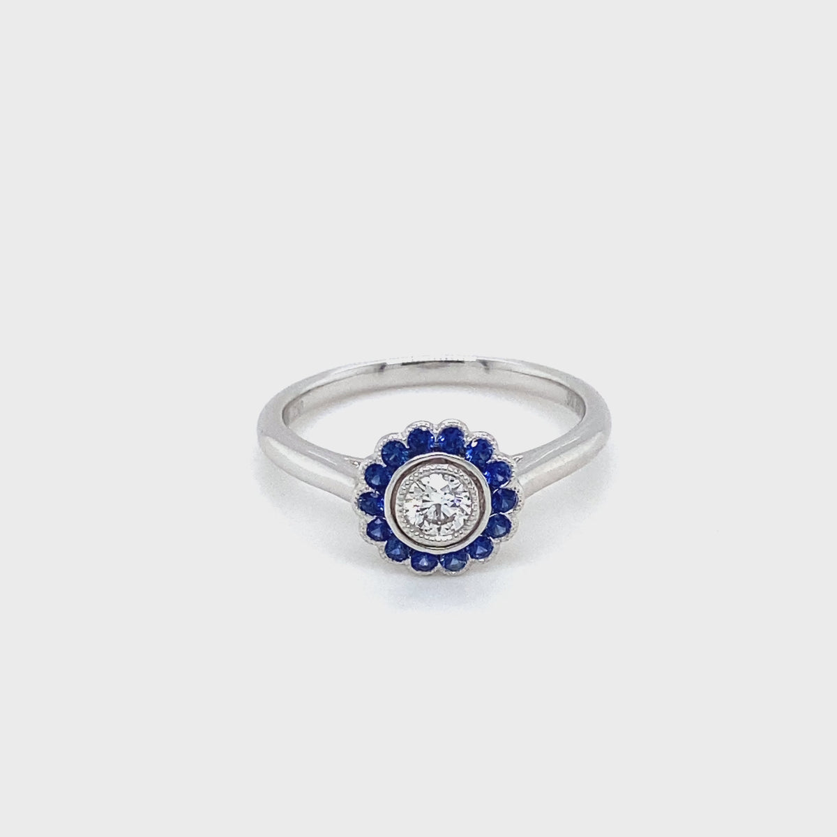 18ct White Gold Blue Sapphire and Diamond Flower Halo Ring