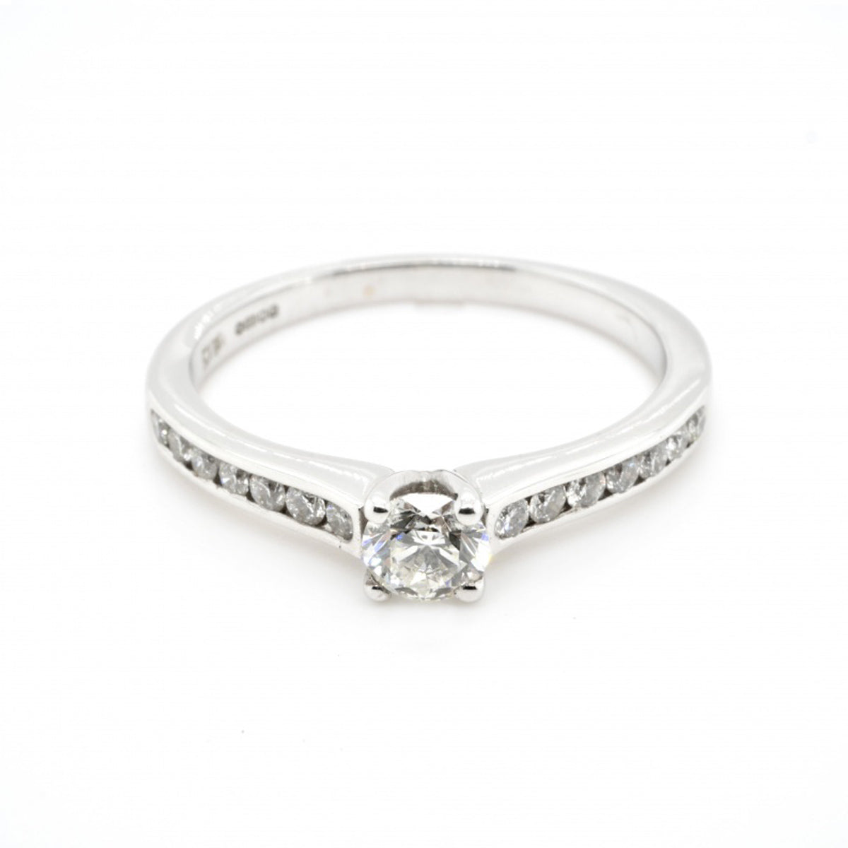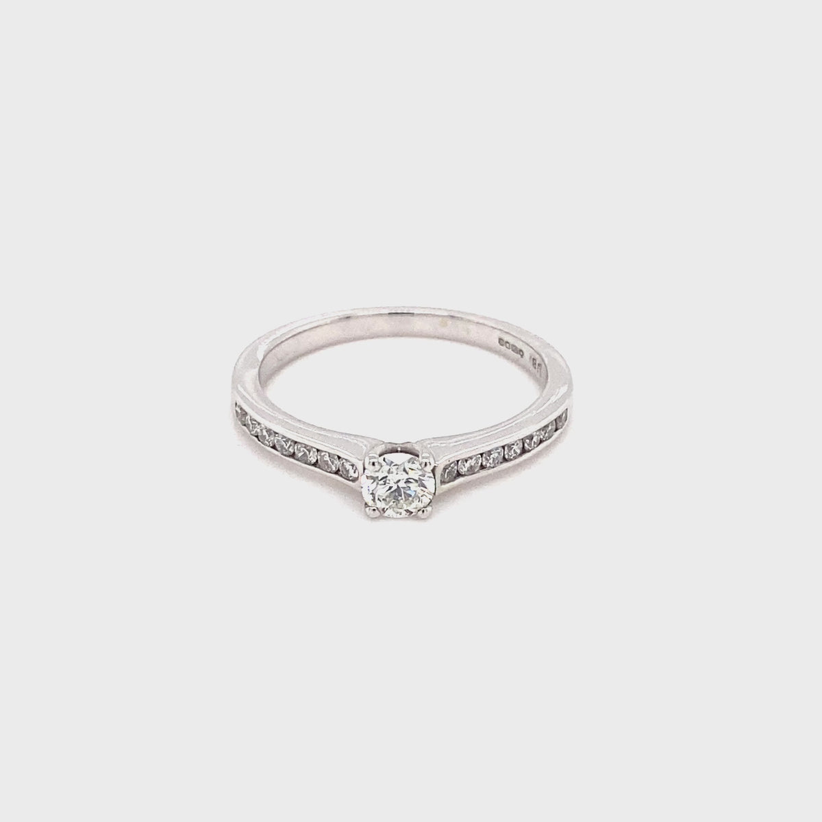 An 18ct White Gold ring with a central round-brilliant Diamond. This elegant ring also has Diamond set shoulders mounted in a channel setting.