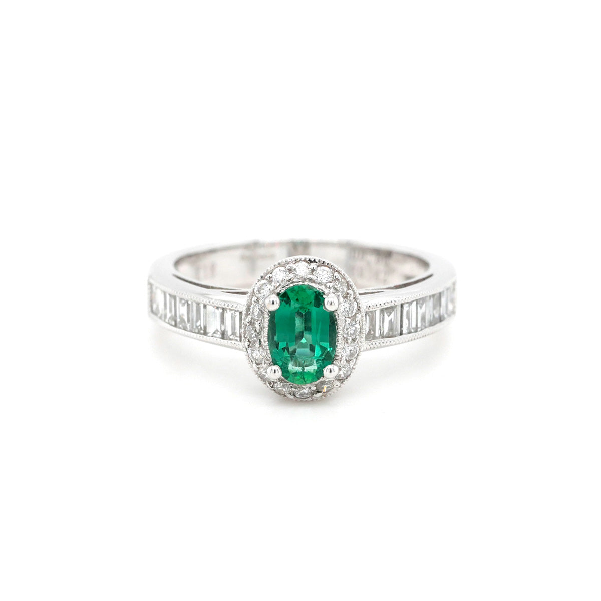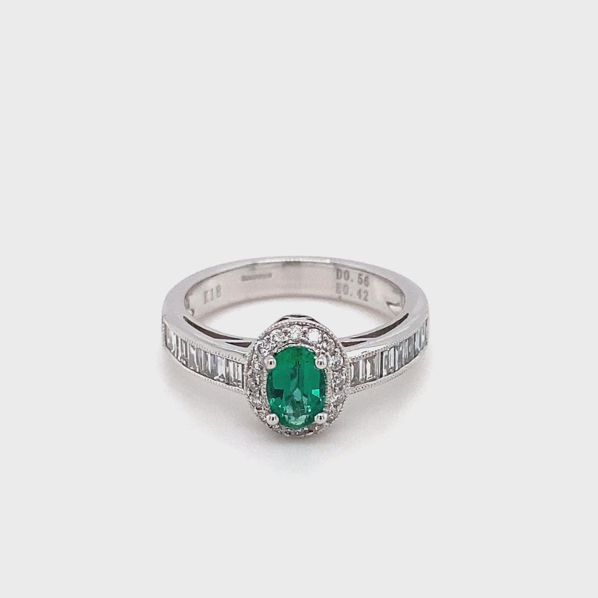 18ct White Gold 0.42ct Emerald & 0.56ct Diamond Halo Ring