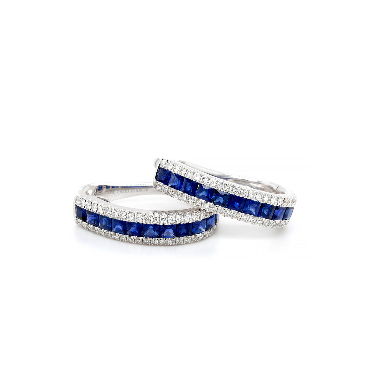 18ct White Gold Princess Cut Sapphire and Round Diamond 3 Row Hinged Hoop Earrings