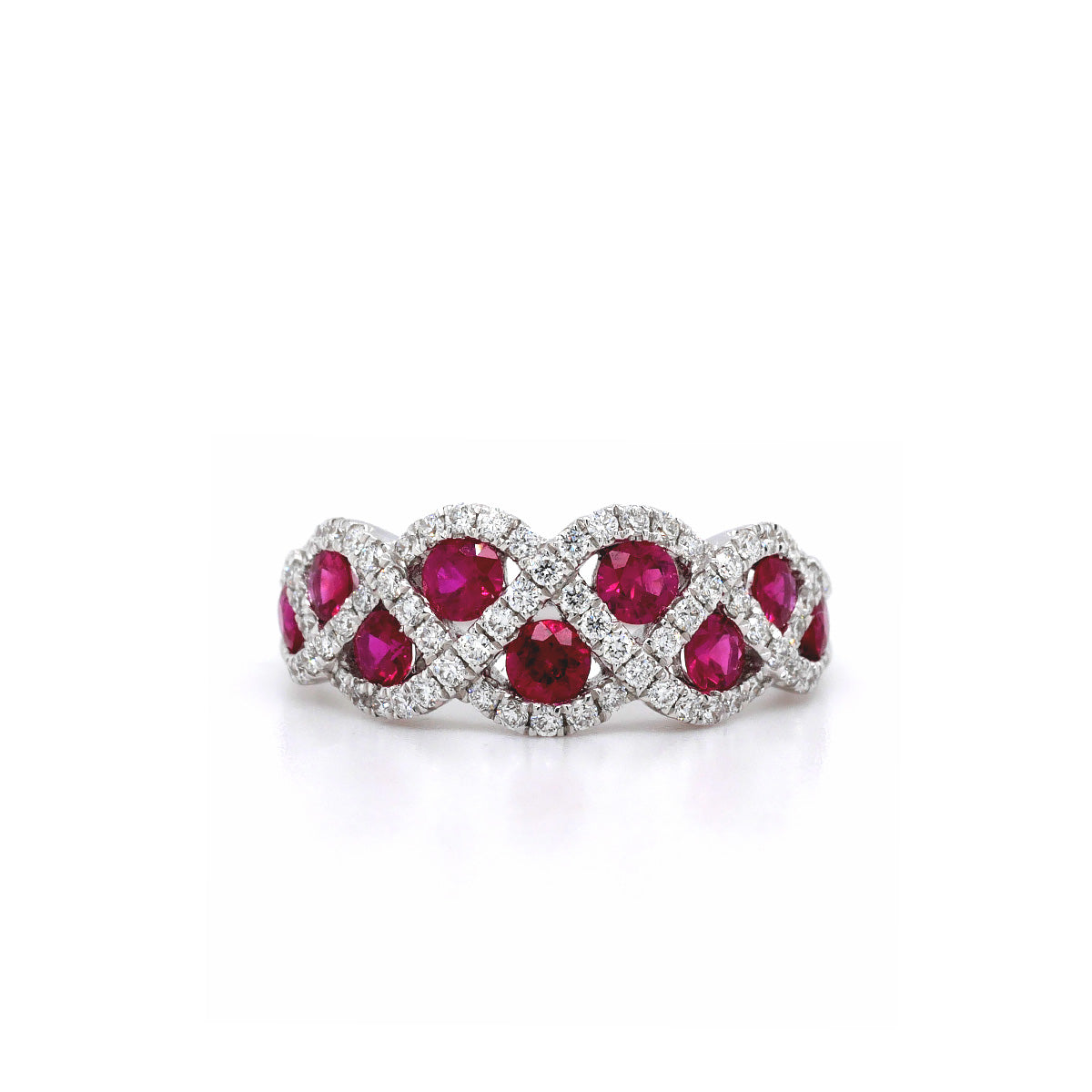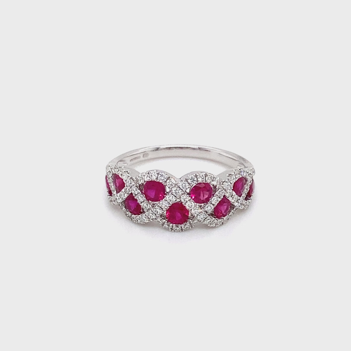 Crafted in luxurious 18ct white gold, this stunning ring showcases an intricate weave design, beautifully combining the rich red hues of rubies with the sparkling brilliance of diamonds. The gemstones are meticulously set to create a mesmerizing pattern that catches the eye from every angle.