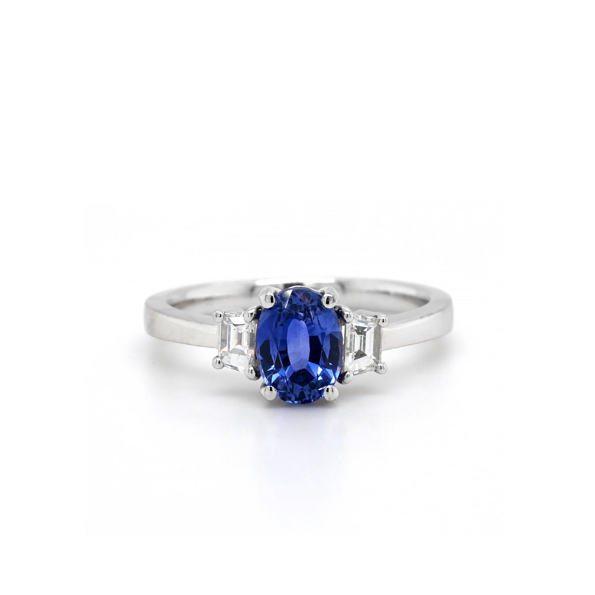 18ct White Gold Oval Cut Sapphire & Emerald Cut Diamond Three Stone Ring - Size M