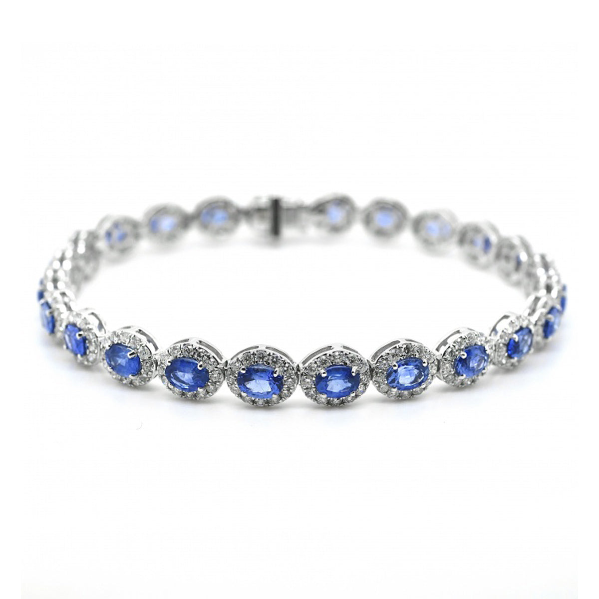 An 18ct white gold bracelet with oval-cut sapphires surrounded by halos of fine diamonds.