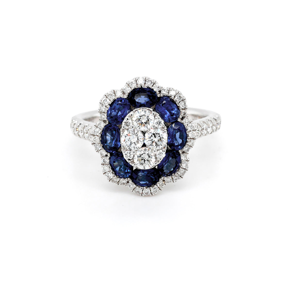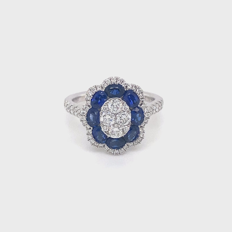 18ct White Gold Sapphire & Diamond Flower Halo Ring