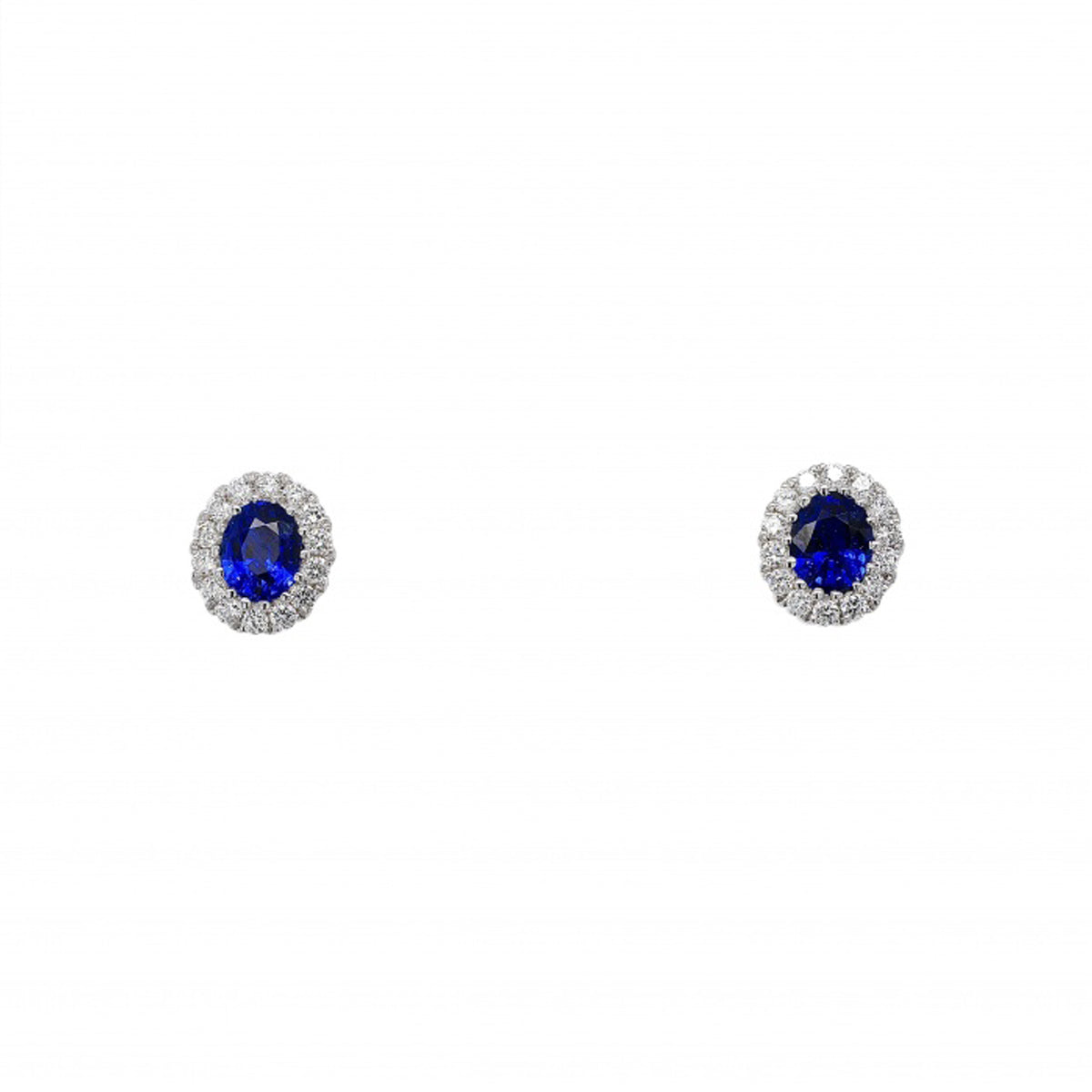 A pair of 18ct white gold stud earrings with a central oval cut sapphire surrounded by a halo of fine diamonds.