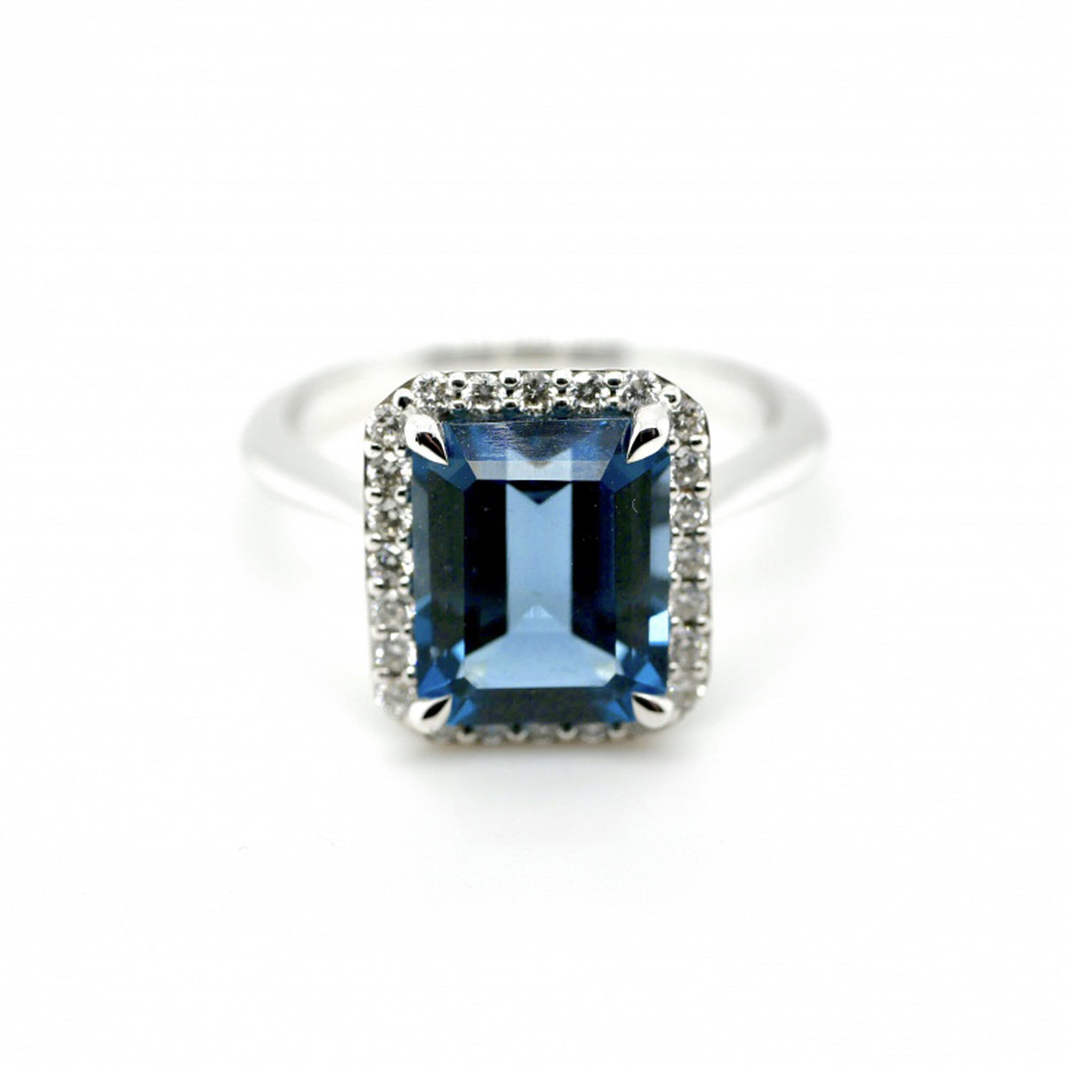 • Design: Square halo surrounding the central topaz