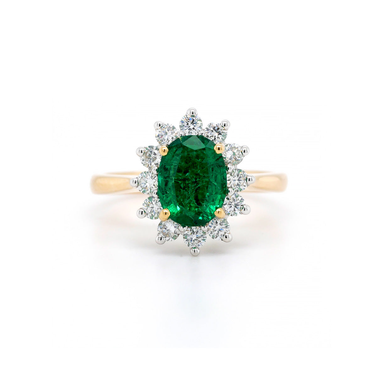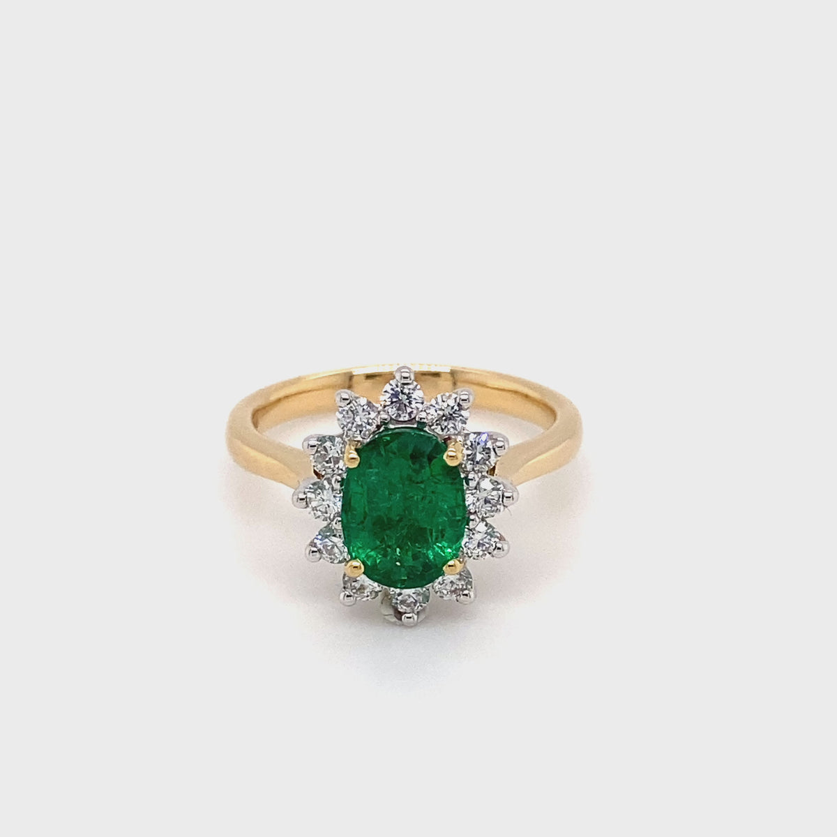 18ct Yellow & White Gold 1.33ct Oval Cut Emerald & 0.44ct Diamond Cluster Ring