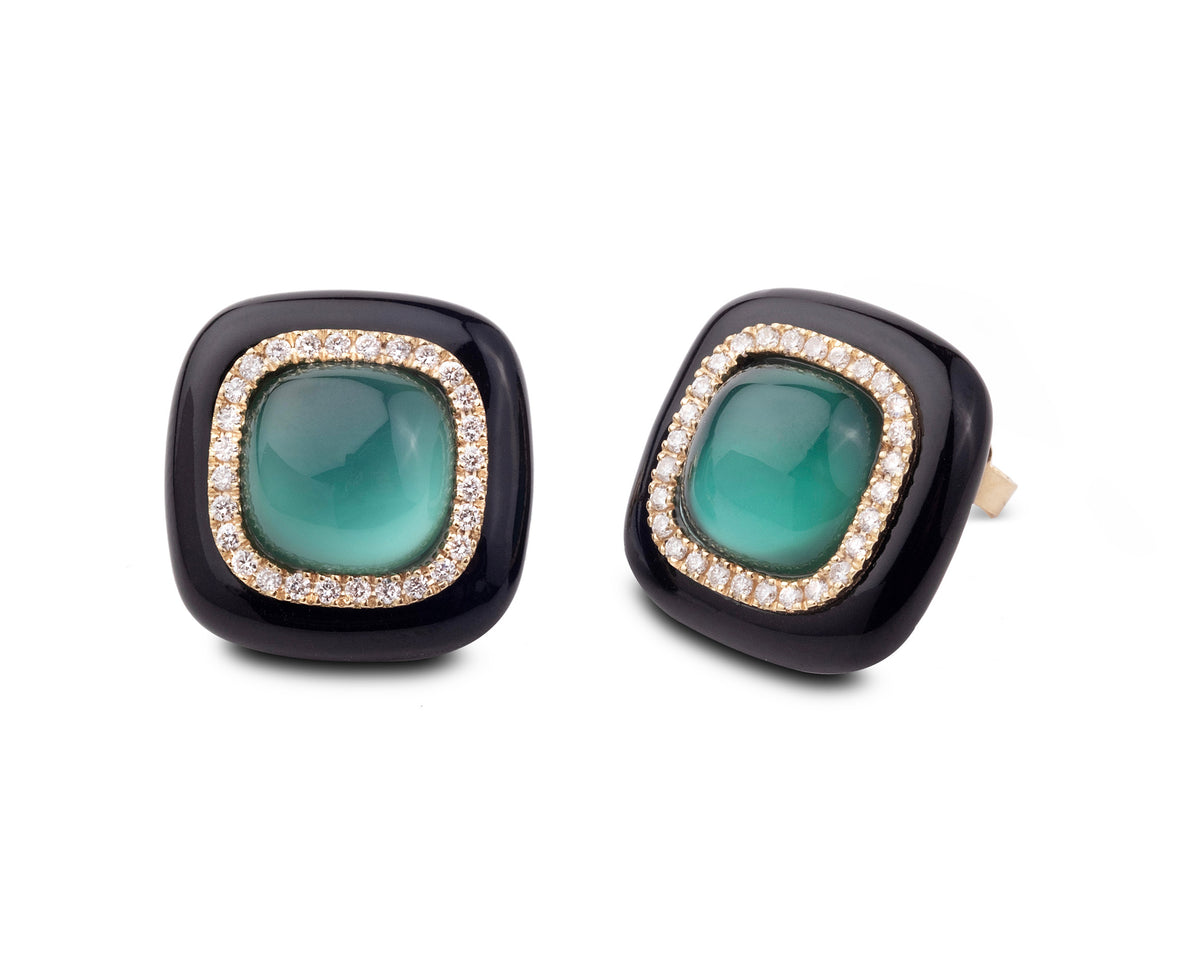 18ct Yellow Gold Enamel Earrings with Green Agate & Diamonds