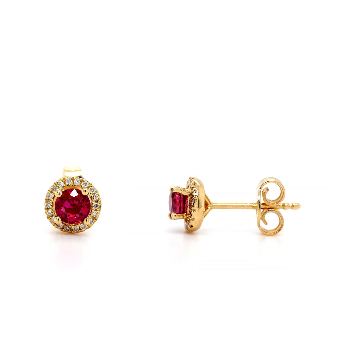 18ct Yellow Gold Round Ruby Earring Studs with Diamond Halo
