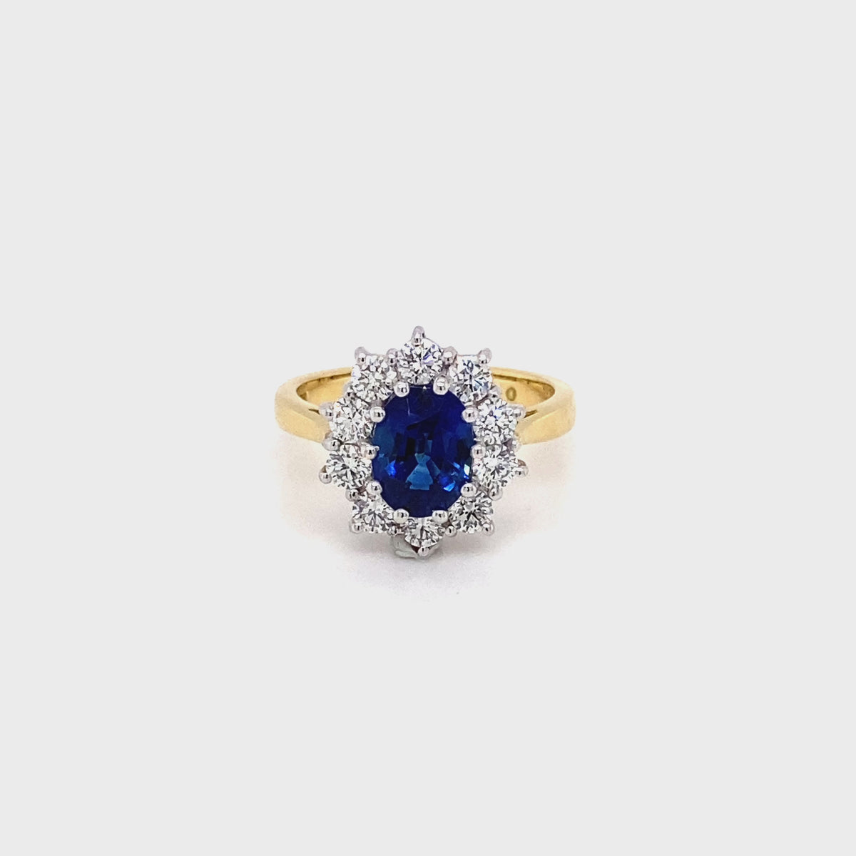 18ct Yellow Gold Blue 1.53ct Sapphire & 0.79ct Diamond Cluster Ring