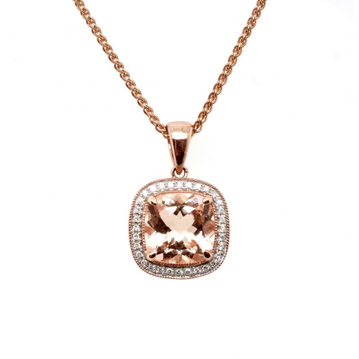 A 9ct rose gold morganite pendant surrounded by a halo of diamonds.