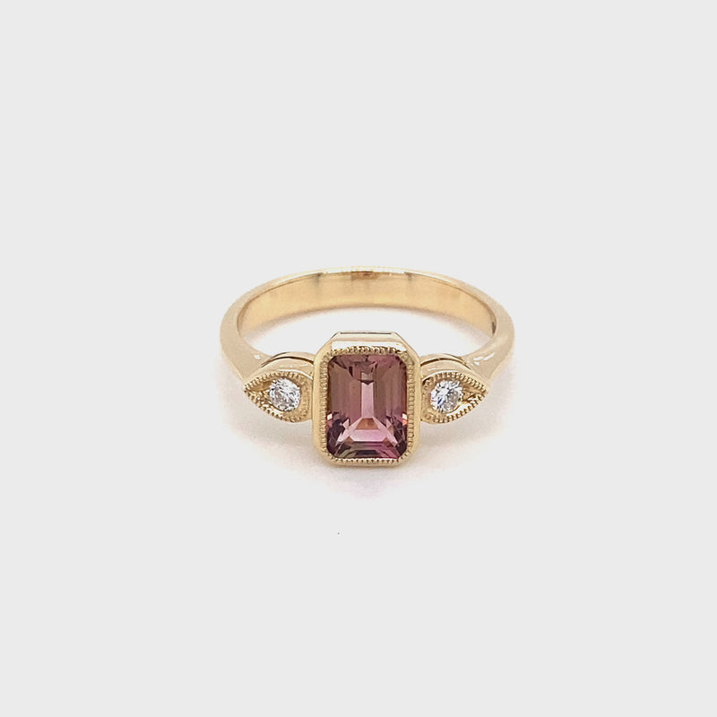 9ct Yellow Gold 3 Stone Pink Tourmaline & Diamond Ring