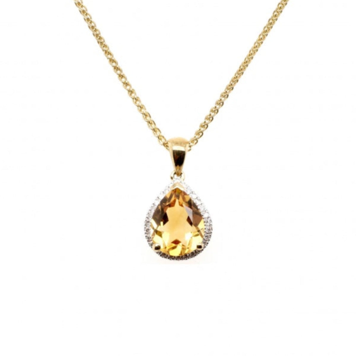 A 9ct yellow gold citrine pendant surrounded by a halo of diamonds.