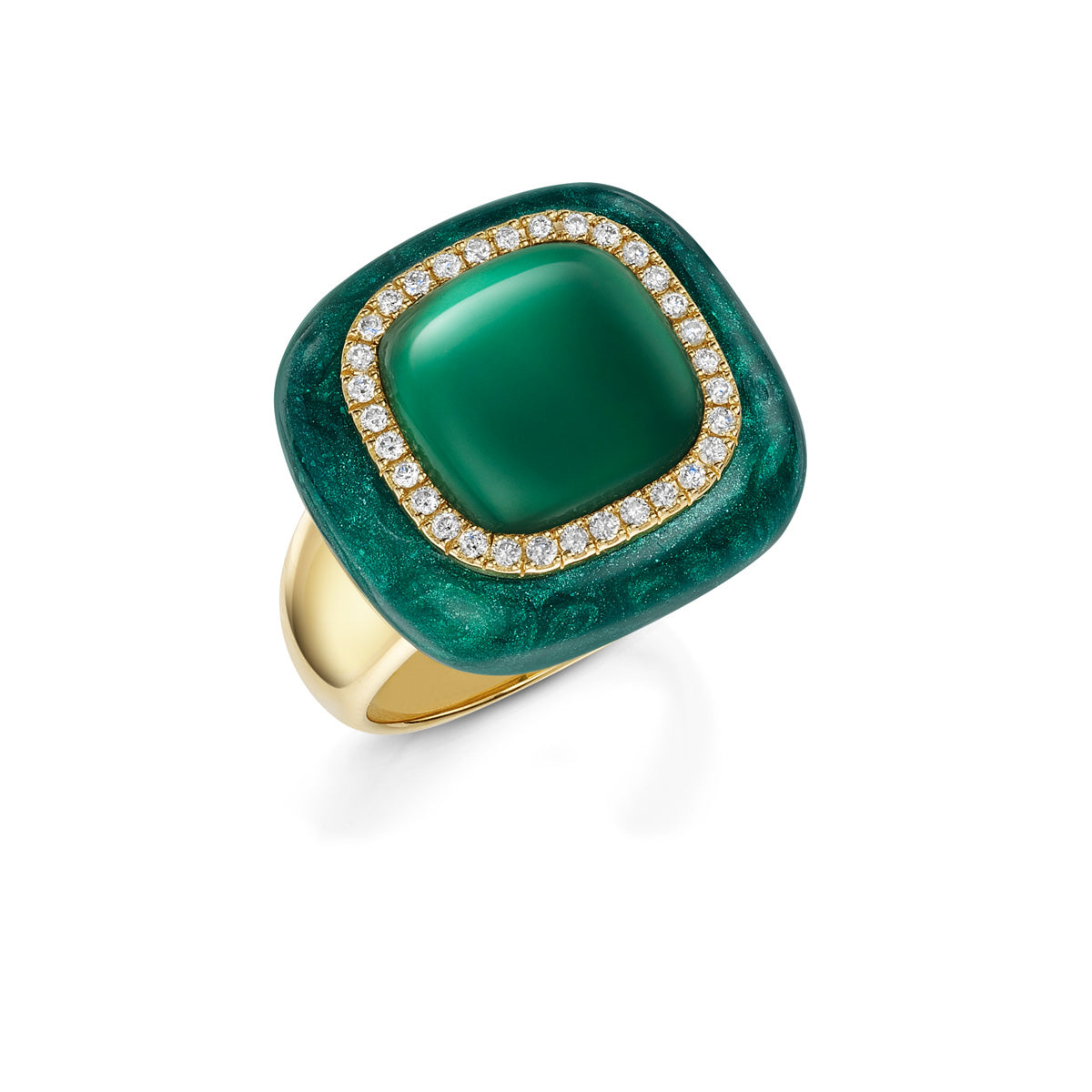 18ct Yellow Gold Green Agate, Diamond and Green Shimmer Enamel Ring