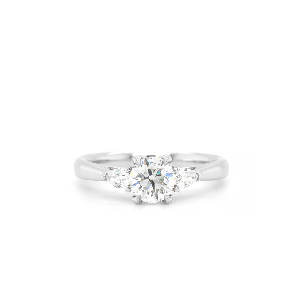 Crafted for those who appreciate true brilliance, this platinum three-stone diamond ring is a striking balance of grace and radiance. Its exquisite combination of natural round and pear-cut diamonds creates a look that is both classic and captivating, making it a piece to be cherished for a lifetime.