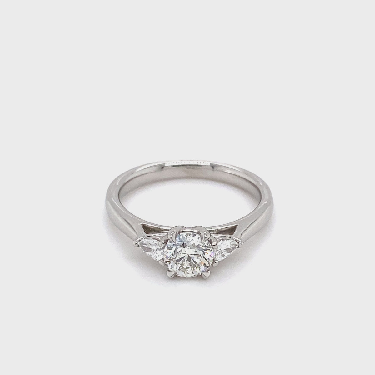 Flanking the centre stone are two exquisite natural pear-cut diamonds, carefully positioned to enhance the brilliance of the design while creating a graceful and elongated silhouette. The platinum setting provides a sleek, enduring foundation, offering both durability and a luminous finish.