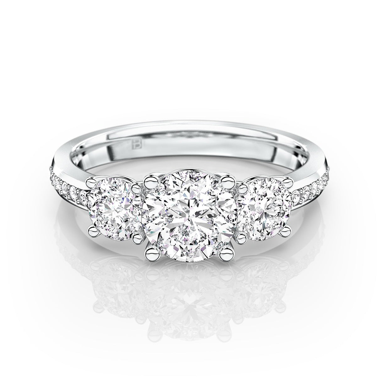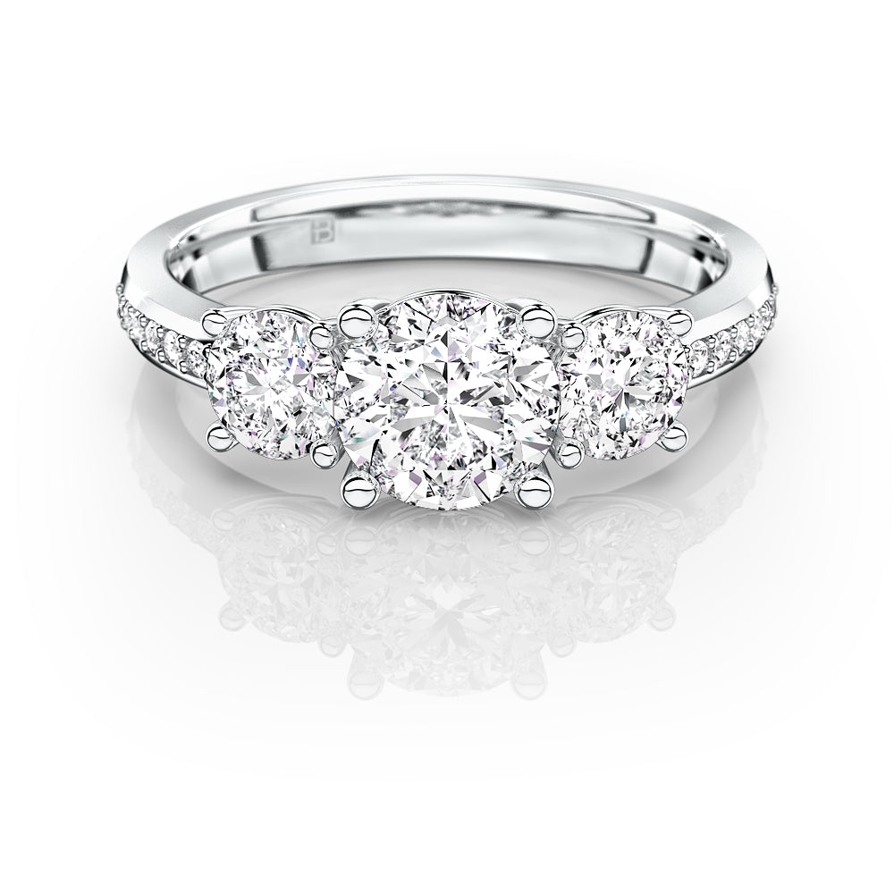 A classic three stone ring with diamond set shoulders. This confident piece incorporates a modern and clean basket style setting. Completed with a courted comfort fit shank.