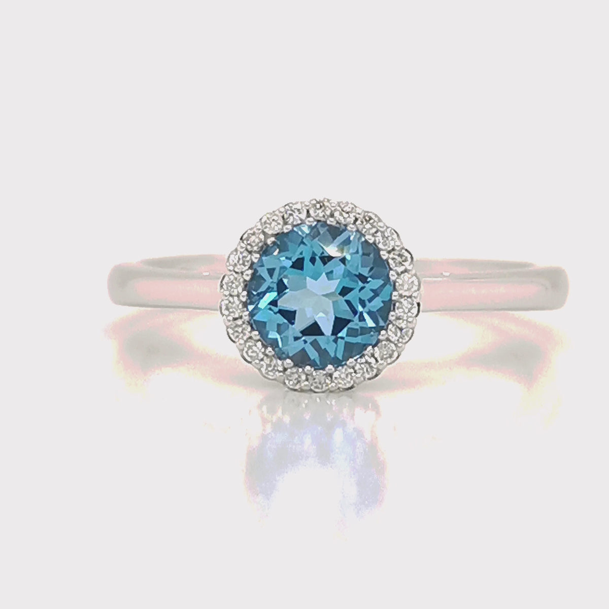 TIVON 18ct White Gold Blue Topaz and Diamond Halo Ring