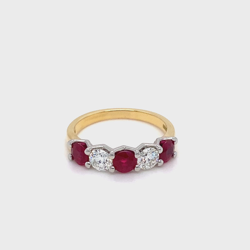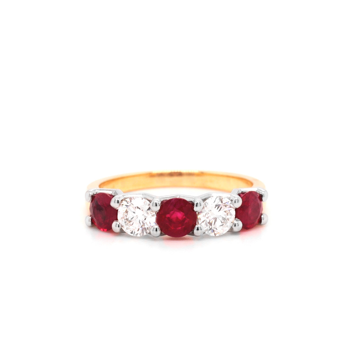 18ct Yellow Gold & White Gold Claw Ruby & Diamond 5 Stone Ring - Size P